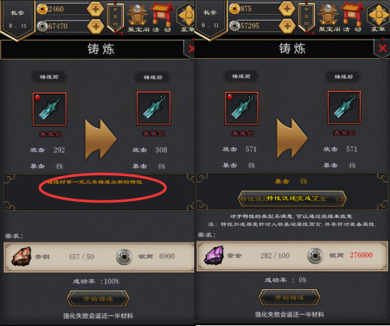 铸炼提升装备等级带来的属性成长还是相当客观的,一件装备从1升级到10级,基础属性基本会增长将近一倍,而且在升级的过程中装备有可能铸炼出新的特性,会大大提升装备的实用性。