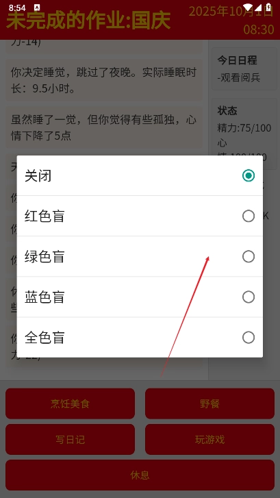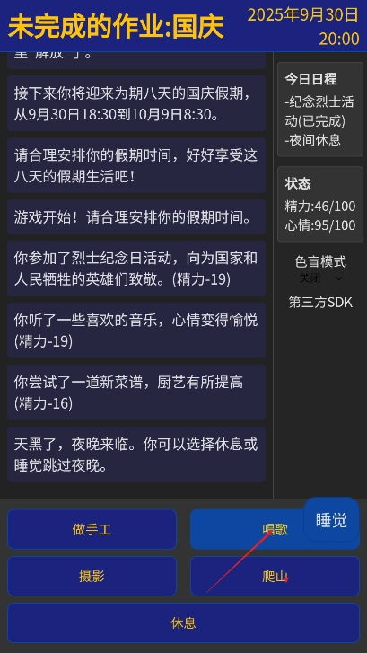 未完成的作业国庆是一款主打轻休闲体验的文字冒险游戏。故事背景设定在国庆与中秋叠加的八天长假,你将化身为一名面临假期规划挑战的学生,在劳逸结合的平衡中推进剧情!